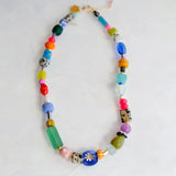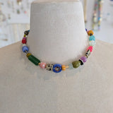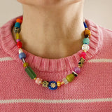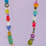 This handmade necklace is a vibrant and playful mix of gemstones, Czech glass, pearls, and acrylic beads. At its center is a handcrafted resin and glass flower bead. Each bead is unique, making this necklace truly one of a kind.