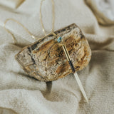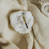 A natural porcupine quill set in a recycled .22 magnum bullet casing with American turquoise. 32" solid brass chain.