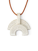 Handmade ceramic pendant on a leather cord. White speckled glaze. Natural brown leather.
