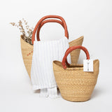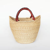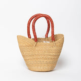 These certified fair trade baskets are handmade in Africa and can be used for just about anything from a market tote to stylish storage. They are hand-weaved, durable and have a nice leather detail. Each basket is hand-made so the color of the handles, shape and size differs with each one. Please specify in the notes if you would like a certain color!