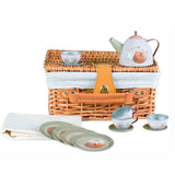 Includes 4 cups and saucers, 4 plates, tin tea pot and a tea towel, in an adorable wicker case.