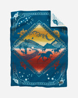 Made in America of the softest pure virgin wool, this Pendleton baby blanket is a treasured gift. Woven in a design of a desert at night, with a stallion, mare and colt galloping fast and free under the starry sky. Reverses for two different looks.
