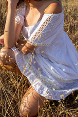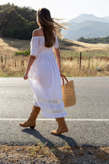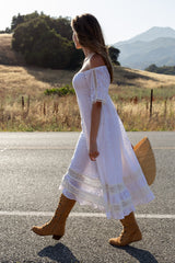 The Katarina Maxi Dress is crafted from 100% embroidered cotton and fully lined. Designed with delicate lace trims at the sleeves and hem, this flowing maxi silhouette also features hidden side pockets. An elastic neckline allows for on- or off-shoulder styling, along with a smocked back for flexible sizing.