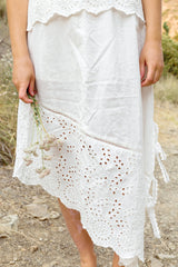 Crafted from 100% embroidered cotton, the Romance forever skirt by Swoon The Label offers an asymmetrical Midi Length skirt with two contrasting embroidered cotton fabric. Fully lined with 100% Organic Cotton Voile and soft elastic waistband with tie for comfort. Thoughtful details like delicate lace side ties add a feminine touch.