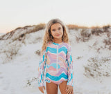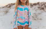 Girls pink, blue, purple rainbow wave surfboard print long sleeve one-piece zip up rash guard with ruffle detail. SPF 50. Double lined throughout. They are fade resistant and have quality upgraded zippers to work freely for multiple seasons of wear. Bottoms are made modest for full coverage with good elastic in legs that will not loosen over time.