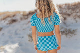 ;Girls turquoise blue checkered print puff sleeve ruched shirred two piece swimsuit with ruffle accents. SPF 50. Double Lined Throughout. High quality FULL Ruffles! They are fade resistant for multiple seasons of wear. Bottoms are made modest for full coverage with good elastic in legs that will not loosen over time.
