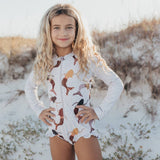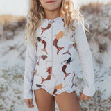 Girls white, beige, brown mermaid print long sleeve one-piece zip up rash guard with ruffle detail.
