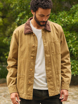 The fit is comfortably roomy. The fabric is washed herringbone twill with a plaid flannel lining and a corduroy collar. It features our signature hidden pockets behind the classic patch pockets (perfect for warming your hands on cooler days) and an inside left-chest pocket.