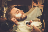 Rich, creamy lathering shave soap with 13 essential oils and rhassoul clay in a mug with boars hair bristle brush in cooper foil stamps box. 4.5oz soap