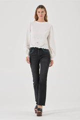 The Stephanie Blouse by Rolla's is the kind of top that makes getting dressed feel easy. A relaxed long-sleeve silhouette with a draped, unhurried fit — softened further by a scalloped neckline, gathered poet sleeves, and custom embroidery across the front and sleeves that gives it a handcrafted, one-of-a-kind feel.
