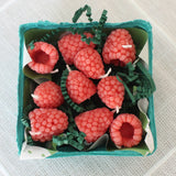 Comes with 10 raspberry birthday candles! The packaging includes the berry basket with green crinkle cut inside the brown kraft box.