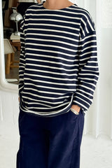 Add a touch of Parisian flair to your wardrobe. The Marseille Top takes inspiration from the timeless Breton stripe uniform, featuring a classic round neckline and an oversized, full-length fit that gently sweeps the hips. Crafted from durable, heavyweight cotton, it offers structure without sacrificing softness, making it an ideal choice for both elevated and casual looks.