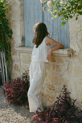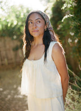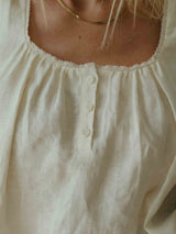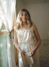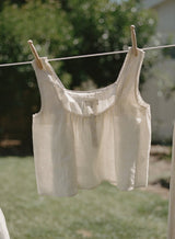An heirloom-inspired piece. Sewn using a lightweight linen - grown and harvested in Europe, spun in Northern Ireland. Tumbled to perfection for a relaxed feel, in a luxuriously soft yet sturdy fabric that gets better with age. Features a très-femme scooped neckline and fixed straps trimmed with petite lace. Dawns a partial placket and gently pleated bodice.