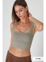 A ribbed knit crop top featuring a scoop neckline and back and vintage wash. Fabric: 92% Nylon / 8% Spandex.