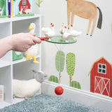 A wooden paddle game from our Baby & Kids Collection displaying a cute farm-themed design. Top of the paddle game features wooden chicken figures that make a fun pecking motion when the paddle ball moves. Our Chickens paddle game is a charming farm-themed gift perfect for kids 3 years and older.