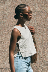 The Camille Top by Rolla's is warm-weather dressing at its most considered. A relaxed shell silhouette in a breathable cotton-flax blend, finished with a scalloped hem, adjustable tie-up sides, and custom embroidery on the front that gives it a handcrafted, artisan quality. It's the kind of top that looks just as good tucked into a midi skirt as it does knotted over high-waisted shorts.