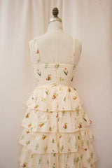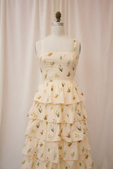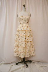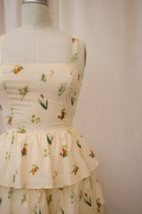 The Tussie dress is the perfect balance of sweet simplicity and flouncy fullness. This midi sundress comes in a cream cotton that is patterned throughout with a watercolor botanical print featuring citrus and florals. Instead of adjustable o-rings, the spaghetti straps feature a hidden elastic that stretches with your body. The clean lines of the bodice are the perfect counterpoint to the volume and drama of the voluminous fully-lined skirt, which features six large tiers that are just made for twirling. A hidden back zipper means you can throw the Tussie dress on in a jiff for your next spontaneous living-room dance party!