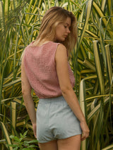 Perfect for ice-cream cones and boardwalk bike rides. These vintage-inspired shorts are made from stretch denim. There is a little hidden elastic under the tush that gives them their cute rounded shape. Amber is 5' 9" tall and wearing size Small.