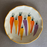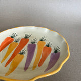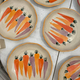 Wheel-thrown and hand-painted colorful carrots. The perfect lunch or salad plate for your fresh harvests. Wavy, gold-painted rim for a handmade, whimsical aesthetic.