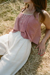 An heirloom-inspired piece. Sewn using a lightweight linen - grown and harvested in Europe, spun in Northern Ireland. Tumbled to perfection for a relaxed feel, in a luxuriously soft yet sturdy fabric that gets better with age. Features a très-femme scooped neckline and fixed straps trimmed with petite lace. Dawns a partial placket and gently pleated bodice.